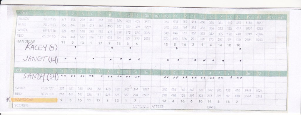 Let’s put this into a direct example: Attached is a mocked up scorecard with Kacey’s handicap, Janet’s handicap and Sandy’s handicap.